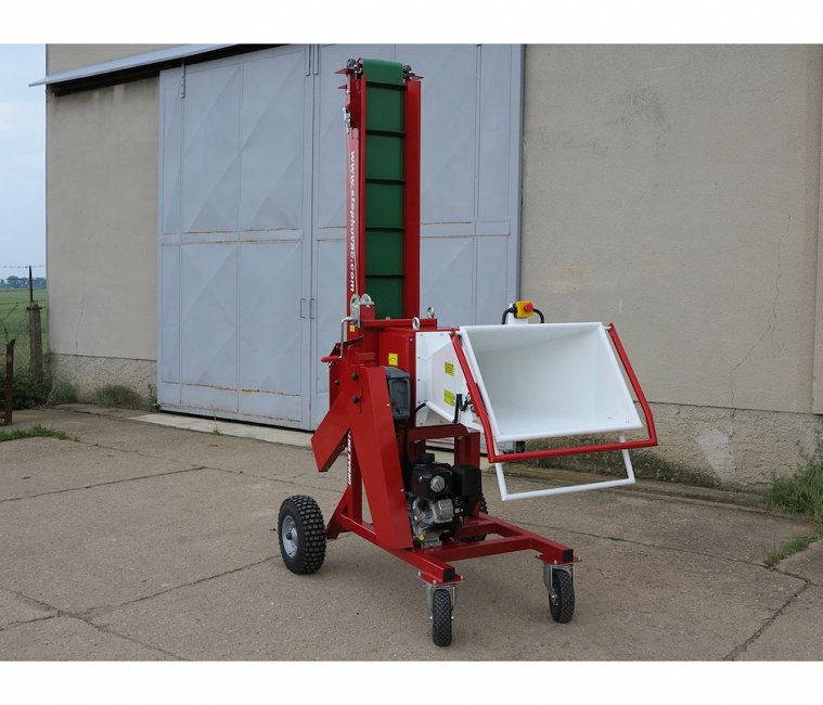 | Il nastro trasportatore Viene utilizzato un nastro trasportatore lungo 2,6 m azionato da una cinghia a V. La pendenza del trasportatore è regolabile da un argano. Il trasportatore viene sollevato in posizione verticale durante il trasporto. È possibile installare sull'estremità del trasportatore gli accessori seguenti: lo scivolo da 0,8 m o un dispositivo di insacco doppio con una gamba di supporto. La tronchettatrice è fissata con quattro viti e il montaggio richiede solo pochi minuti. |  |